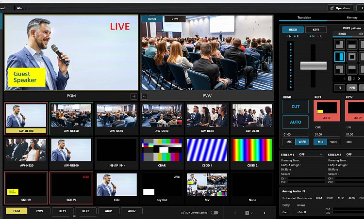 Yeni yazılım kontrol paneli, anahtarlayıcı işlevlerinin bir bilgisayar veya tabletten (Windows 10/11 veya MacOS Monterey/Ventura/Sonoma) rahatça kontrol edilmesini sağlayacak. Geleneksel olarak düğmeler ve düğmelerle gerçekleştirilen giriş/çıkış kaynaklarının ayrıntılı ayarları ve onayı, bilgisayar klavyesi veya dokunmatik ekran ile kolayca gerçekleştirilebiliyor. Çekim öncesi ve esnasındaki sürece verim katmak için çekme belleğinin sıralanması ve fotoğraf belleğinin doğrudan yazılması/değiştirilmesi gibi yazılım kontrol panellerine özel işlevleri de bulunuyor. GUI, birden fazla video girişi/çıkışı arasında kolay geçiş sağlamak için Panasonic'in popüler büyük anahtarlayıcılarına benzer şekilde kontrol ekranını, canlı video izlemeyi ve çoklu görüntüleyiciyi entegre ediyor. Sezgisel GUI, minimum deneyime sahip operatörler de dahil olmak üzere tek bir kişi tarafından kolayca kullanılabiliyor.