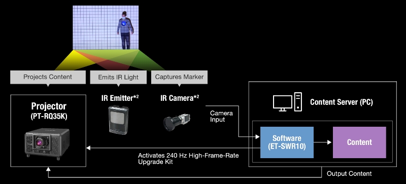 Panasonic PT-RQ35K projektör için oluşturulan Gerçek Zamanlı İzleme Yazılım Geliştirme Kiti (ET-SWR10) ile görüntüleri hızlı hareket eden nesnelerin üzerine gerçek zamanlı olarak tam hassasiyetle yansıtarak olağanüstü görsel efektler elde edilebiliyor. Projektör bir kızılötesi yayıcı, kamera, işaretleyici ve bir içerik sunucusuyla birlikte kullanıldığında, prodüksiyon şirketleri tarafından ve canlı eğlence etkinlikleri, tema parkları, müzeler ve e-sporlarda kullanım için ideal olan Gerçek Zamanlı İzleme Projeksiyon Gönderimi Sistemi sunuyor.