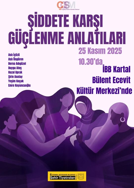 “Şiddete Karşı Güçlenme Anlatıları” adlı okuma tiyatrosu 25 Kasım 2025 Salı günü saat 10.30’da İBB Kartal Bülent Ecevit Kültür Merkezi’nde Sosyal Hizmetler Dairesi Başkanlığı Kadın ve Aile Hizmetleri Şube Müdürlüğü organizasyonu içinde seyirciyle buluşuyor.