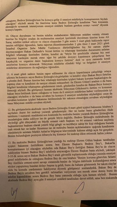 Sedat Peker bu gün gerçekleştirdiği ifşalarda: “Türkiye’de bürokrasi ve siyasetle iç içe bir narko yapı yaratılmaya çalışılıyor” ifadelerini kullandı ve şu bilgileri aktardı: “Bulunduğum Birleşik Arap Emirlikleri’yle ülkemiz arasında tekrardan dostane ilişkiler kurulup karşılıklı görüşmeler başlayınca, makamına saygı duyduğum ancak kendisinden nefret ettiğim Süleyman Soylu ve de AKP milletvekili Tolga Ağar’ın (derin mehmet’in oğlu.) ‘Yakın zamanda Türkiye’ye getireceğiz, o zaman görecek’ tarzındaki arkamdan söyledikleri tehditvari kelimeleri duyunca bunları aktarmak benim için farz oldu. Ocak ayında Ermeni Vakfı Başkanı Bedros Şirinoğlu’ndan resmi koruma polisi vasıtasıyla yüksek rütbeli bazı emniyet müdürleri 500 bin TL rüşvet isterler. Olay şu şekilde gelişir. Foto Film Şube Müdürü Ekrem Eren Ermiş, Bedros Şirinoğlu’nun koruma polisi Selami Tellioğlu’nu yanına çağırarak Bedros Şirinoğlu’na ’Fazladan bir ihtisaslı araç yapmışsınız (kanun dışı bir şekilde), bu arabayla da yasadışı bir şekilde kara para taşımacılığı yapıyormuşsunuz. Bana bunu Kaçakçılık Şube Müdürü Engin Süngü söyledi. Koruma Şubeden sorumlu İl Emniyet Müdür Yardımcısı Ali Saraç da biliyor! Bu konu İl Emniyet Müdürü’ne aksettirilecek. Bedros Bey 500 bin TL verirse konu kapanacak’ diyor. Koruma polisi olayı Bedros Bey’e anlatır ve bu üst müdürlerin şikayet edilmesi fikrini verir. Önce İl Emniyet Müdürlüğündeki bazı yetkililere konu anlatılır. Daha sonrasında, Bedros Bey daha önceden tanıdığı Süleyman Soylu’ya önce mektup yazar, daha sonra da telefonla görüşüp Süleyman Soylu’yu bilgilendirir. Makamına saygım olan ancak kendisine saygı duymadığım Süleyman Soylu’da gereğinin yapılacağını söyler. Müfettiş görevlendirir. Esas hikaye bundan sonra başlar. Koruma polisi, emniyet müdürüyle arasında geçen konuşmaları ses kaydına aldığı, sayfalarca süren Whatsapp yazışmalarının çıktısını alarak dosyaya ekler. Ancak enteresan gelişmeler olur. Rüşvet istenen ses kayıtları, Whatsapp yazışmaları ortadayken; 3 emniyet müdürü korunurken bu delilleri kaydeden koruma polisini sıkıştırmaya başlarlar (dosyayı kapatmak için). Ocak ayında meydana gelen bu olayda halen daha bir netice yok. Konu kapatılmak isteniyor. Bedros Bey koruma polisinin görevini layığıyla yaptığını söyleyip diğer müdürler için ‘Bunlar üniformalı soyguncular’ diyor. Koruma polisi aniden görev yeri değiştirilince isyan edip, emeklilik dilekçesi verip görevden ayrılıyor. Ancak Koruma Şubeden sorumlu müdür yardımcısı hala görevinin başında. Kaçakılık Şube Müdürü Engin Süngü hala görevinin başında. Foto Film Şube Müdürü Ekrem Eren Ermiş bildiğim kadarıyla şark tayinine gitmiş, Ağrı’ya tayin olmuş. Ancak o da görevinin başında. Şu ana kadar ses kaydı, Whatsapp yazışmaları olduğu halde konu savcılığa aksettirilmemiş. Olayın üzerinden 9 ay geçtiği halde müfettişler soruşturmayı bitirmemiş. Yani tabiri caiz ise hasır altı edilmiş.”