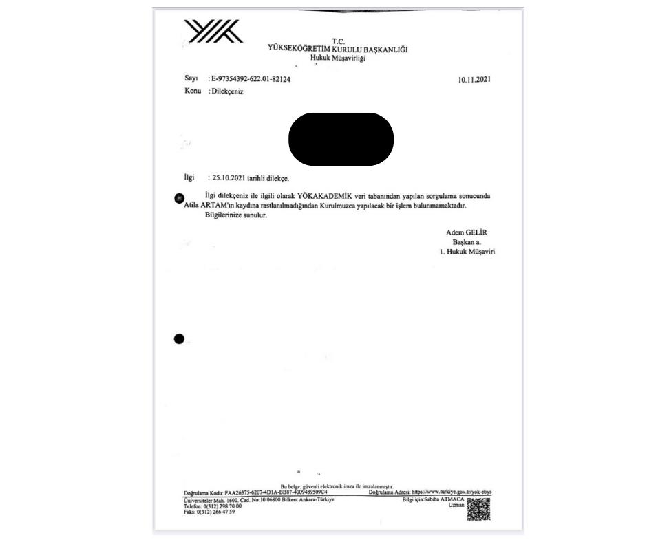Prof. Dr. Atila Artam kariyerini “iş adamlığını ve akademisyenliği birlikte götürmek” üzerinden tanımlıyor. CV’sinde lise ve yükseköğrenimini ABD’de tamamladığı bilgisi yer alıyor. Oysa iddialar aksini söylüyor. Üniversitesi Kıbrıs’ta tamamladığı ileri sürülen Atila Artam hakkında flaş bir belge ortaya çıktı. Yükseköğretim Kurulu (YÖK) Hukuk Müşavirliği’nin gelen bir dilekçe yanıtında “Atila Artam hakkında bir kayda ratlanmadığına” yer verildi.
