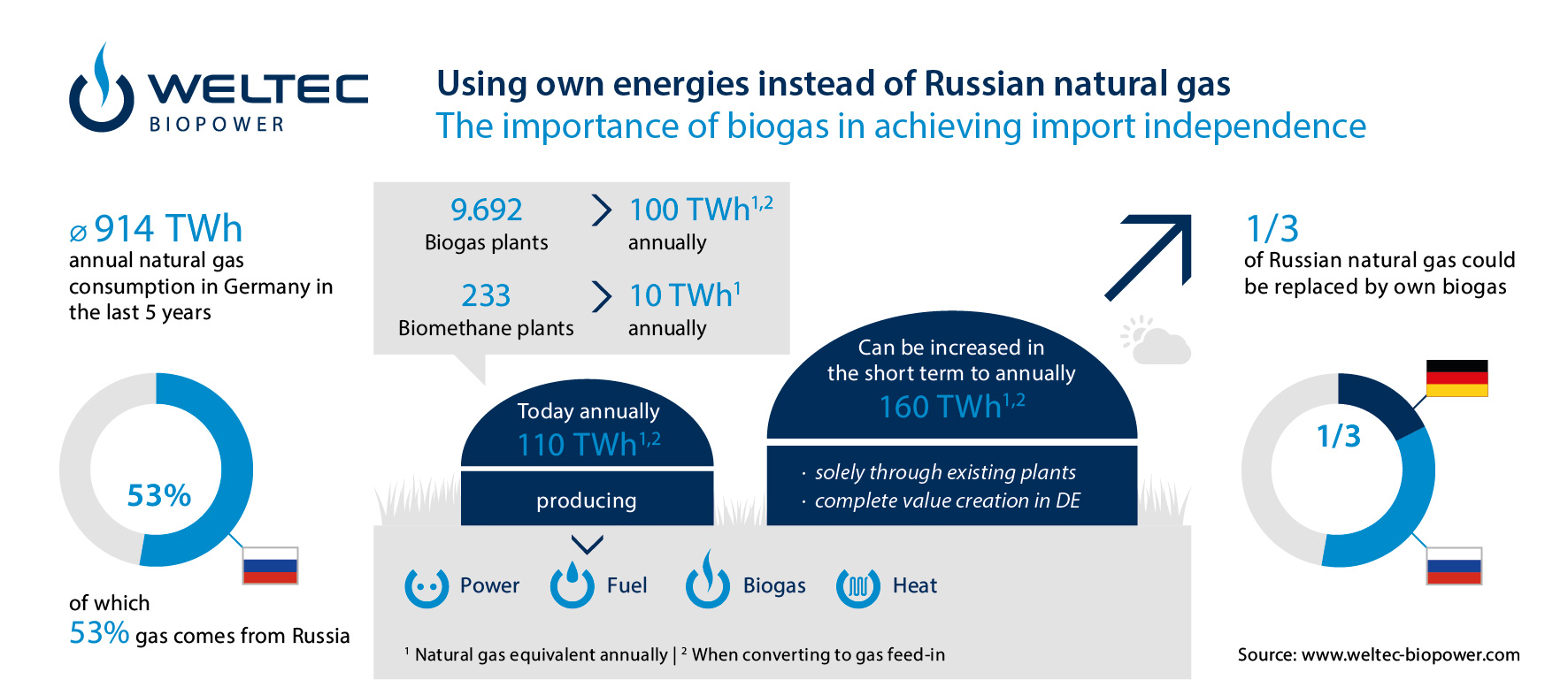 Australia is not the only place where renewable energy sources are gaining in significance; in Germany, too, the topic is attracting increased attention. The war in Ukraine is now forcing countries to reach their climate goals faster, to get prepared for a potential discontinuation of the supply of Russian natural gas and to close any resulting supply gap as quickly as possible. In the medium run, Germany could deliver 160 TWh of biomethane from its existing biomethane and biogas plants alone – enough to replace about a third of the imported Russian natural gas. (See enclosed chart)