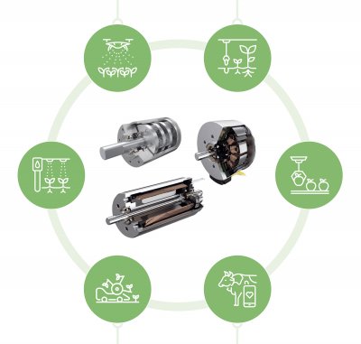 Geleneksel büyük cihazların aksine, akıllı tarımda kullanılan makineler ve bileşenler genellikle daha kompakt ve daha hafiftir. Bu da motorlar için çok daha az yer olduğu anlamına gelir. Bununla birlikte, ekim diskleri, kanatlar, kavrayıcılar, robot kolları veya makasların tahrikleri olarak, ilgili görevi sayısız döngüde güvenilir bir şekilde yerine getirmek için yeterli gücü sağlamaları gerekir. Aynı zamanda, otonom üniteler genellikle enerjilerini sınırlı güç rezervine sahip pillerden aldıkları için son derece verimli çalışmalıdırlar. Ayrıca tahrik elektroniklerini ağ bağlantılı yapılara entegre etmek ve akıllı kontrolü mümkün kılmak da gereklidir.