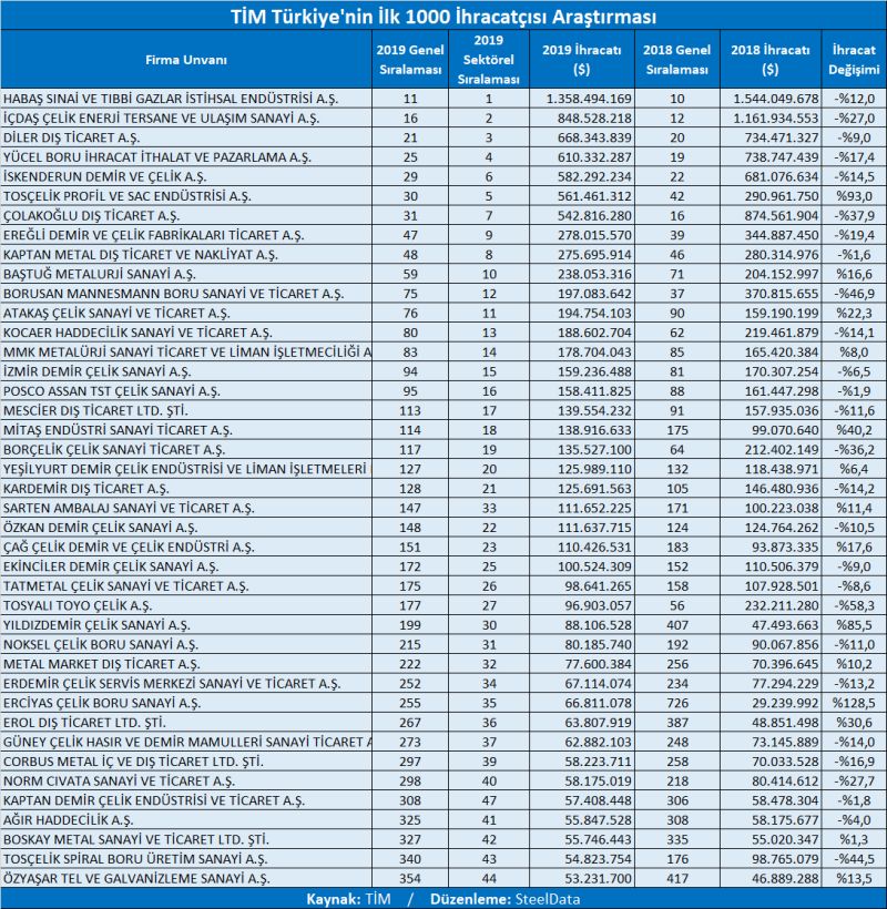 TİM 1000 İhracatçı araştırmasının ilk 350'si içerisinde yer alan çelik sektör firmalarının listesine görselde yer verilmiştir.