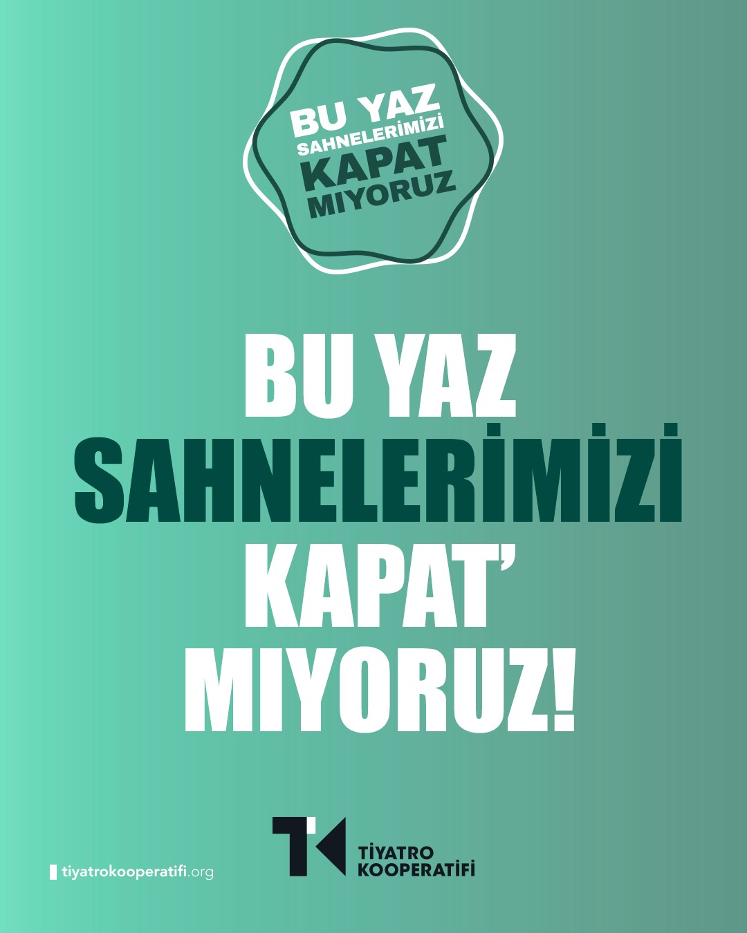 Tiyatro Kooperatifi, karşı karşıya kaldığımız ekonomik ve toplumsal zorluklar karşısında sahne sanatlarının birleştirici, iyileştirici ve dayanışmacı gücünü hep birlikte büyütmek üzere “Bu Yaz Sahnelerimizi Kapatmıyoruz” kampanyasını başlatıyor. Haziran, Temmuz ve Ağustos aylarını kapsayan yaz sezonu boyunca, kooperatife dahil tiyatrolar sahnelerini açık tutarak seyirciyle buluşmaya devam edecek ve dayanışmayı büyütecek.