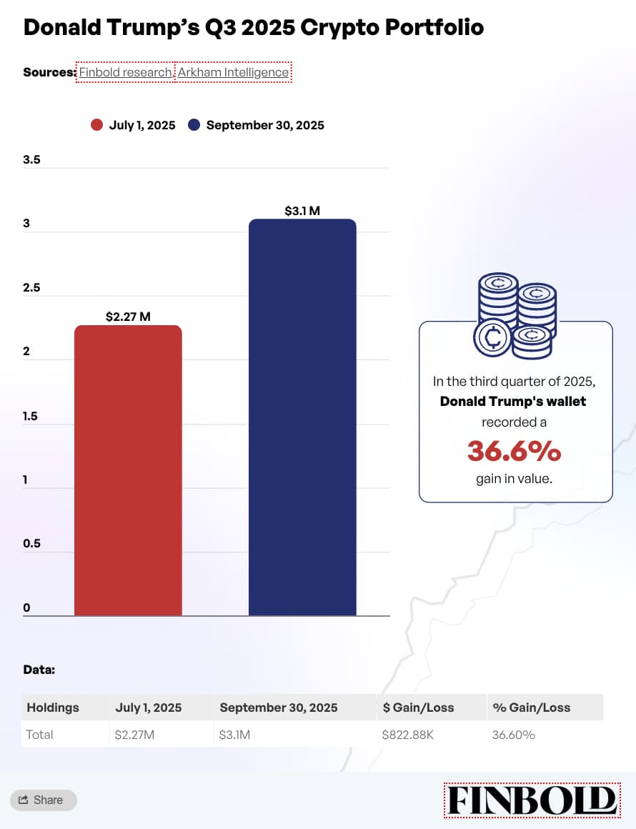 Finbold araştırmasına göre, Trump'ın cüzdanı 1 Temmuz'da 2,27 milyon dolardan 30 Eylül'de 3,10 milyon dolara yükseldi ve bu da kağıt üzerinde yaklaşık 823.000 dolarlık bir kazanç anlamına geliyor. Analiz, Arkham tarafından takip edilen zincir içi verileri kullanan Finbold'un 2025 3. Çeyrek Kripto Para Piyasası Raporu'ndan alınmıştır.