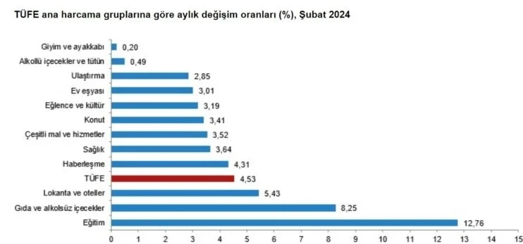 En yüksek aylık fiyat artışı, yarıyıl tatilinin ardından okulların açılmasıyla talebin arttığı eğitim harcamalarında kaydedildi. Yüzde 12,76 olarak ölçülen eğitim enflasyonunu, yüzde 8,25 ile gıda ve alkolsüz içecekler enflasyonu ve yüzde 5,43 ile lokanta ve otel harcamaları izledi.