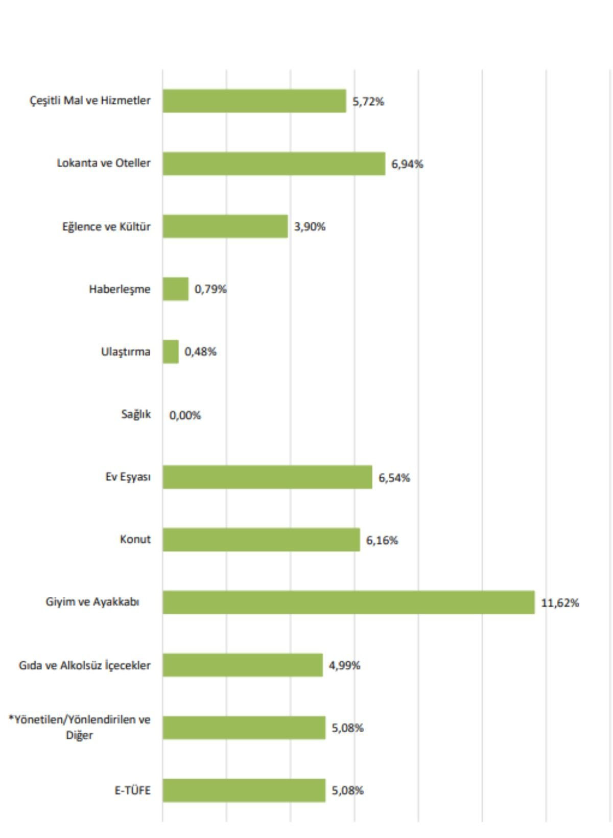 TÜİK alt grupları gösterge olarak alındığında en az aylık artış yüzde 0.00 ile Sağlık en fazla yükseliş ise yüzde 11,62 ile Giyim ve Ayakkabı kaleminde gerçekleşmiştir.