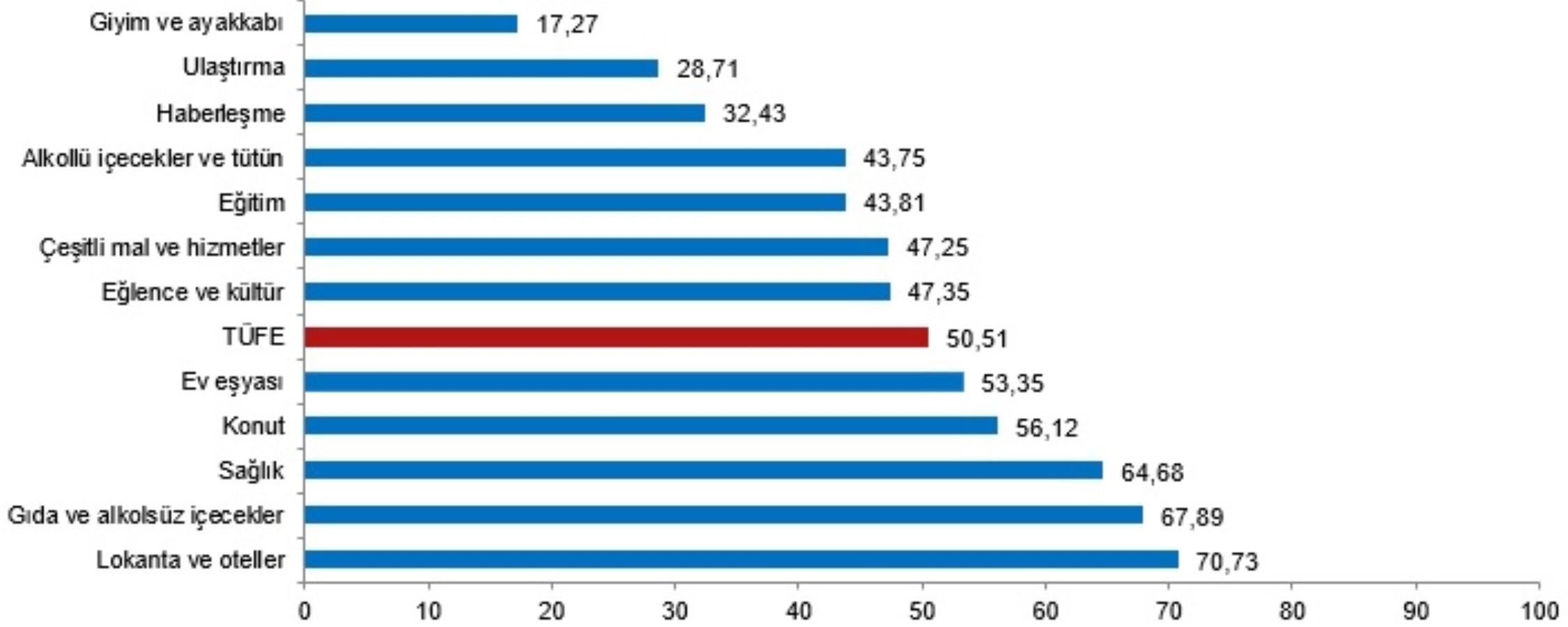 Ana harcama grupları itibariyle martta en yüksek yıllık artış yüzde 70,73 ile lokanta ve otellerde yaşandı. Lokanta ve oteller grubunu yüzde 67,89 ile gıda ve alkolsüz içecekler, yüzde 64,68 ile sağlık grubu takip etti.