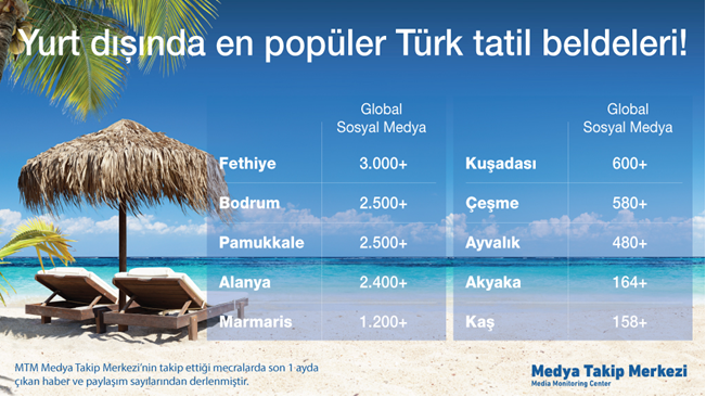 Konuya dair, MTM’nin profesyonel sosyal medya takip servisi DigiLup verilerine göre; Türk turizm beldeleri, global çaptaki sosyal medya mecrasında, Türkiye’ye göre %83 daha az konuşulsa da 14 bini aşkın yorum ve paylaşıma konu oldu. Yabancı turistin en çok ilgi gösterdiği Fethiye, 3 binden fazla paylaşıma konu olurken, Türkiye’nin en popüler tatil beldesi Bodrum ise, 2 bin 500’den fazla konuşularak listenin 2. sırasında yer aldı. 2 bin 500’i aşkın paylaşım ile Pamukkale’nin 3. olduğu listede; Alanya ise 2 bin 400 paylaşım ile en çok konuşulan 4. bölge oldu.