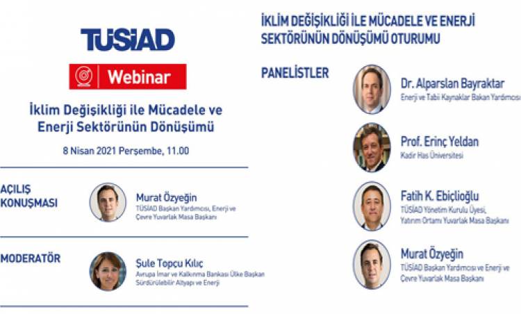 Webinara konuşmcı olarak; Enerji ve Tabii Kaynaklar Bakan Yardımcısı Dr. Alparslan Bayraktar, Kadir Has Üniversitesi Öğretim Üyesi Prof. Erinç Yeldan, TÜSİAD Yönetim Kurulu Üyesi, Yatırım Ortamı Yuvarlak Masa Başkanı Fatih K. Ebiçlioğlu, TÜSİAD Başkan Yardımcısı ve Enerji ve Çevre Yuvarlak Masa Başkanı Murat Özyeğin katıldı.