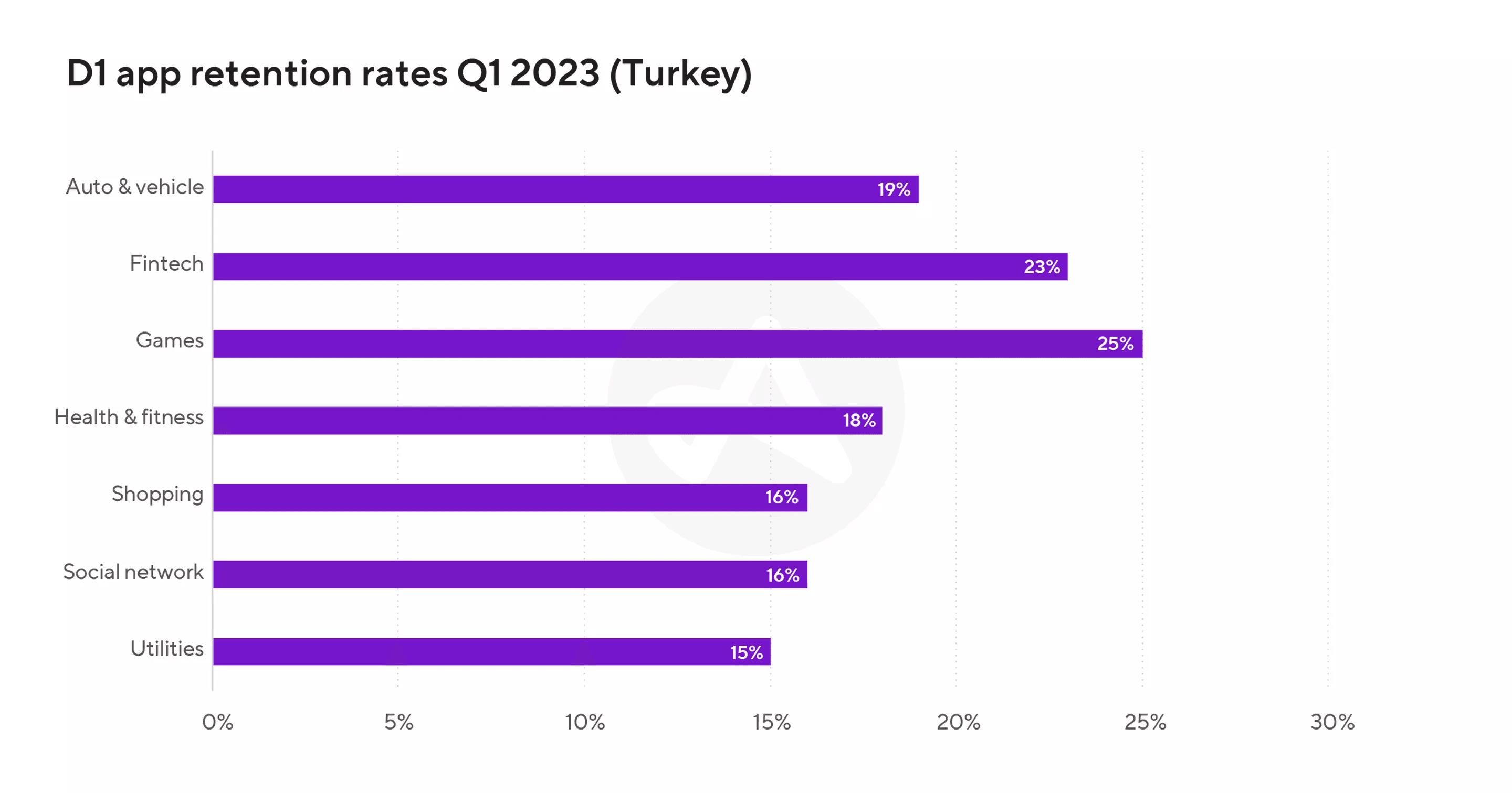 2023'ün ilk çeyreğinde, mobil oyun ve fintech uygulamaları, sırasıyla %25 ve %23'lük 1. Gün elde tutma oranlarıyla en çok etkileşime geçen kullanıcılara sahip oldu. Hemen arkasından gelen otomobil ve araç uygulamaları %19'luk 1. Gün oranıyla üçüncü sırada yer alırken, sağlık ve fitness uygulamaları da %18'lik oranla çok geride kalmadı. Alışveriş ve sosyal ağ uygulamaları ise %16 ile daha düşük bir elde tutma oranına sahip(BKZ Grafik3).
