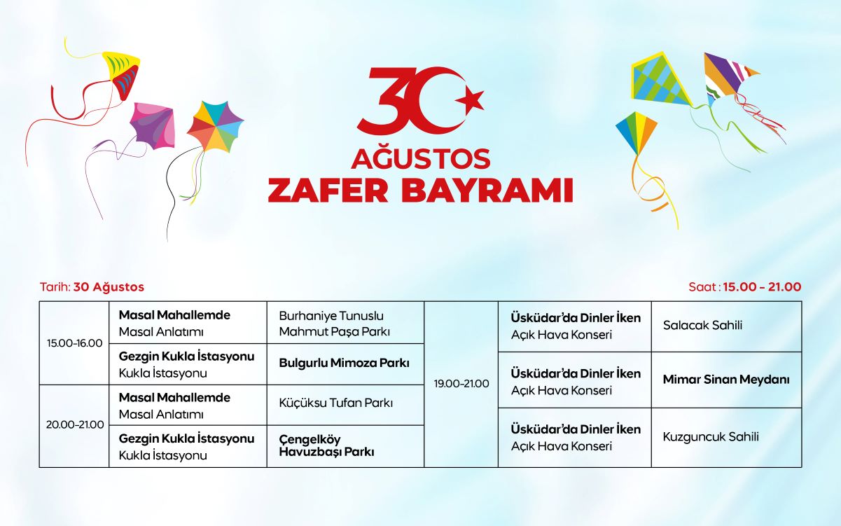 Bayram kutlamalarının merkezinde Uçurtma Festivali yer alıyor. 30 Ağustos cumartesi günü saat 12.00 ile 18.00 arasında Üsküdar İskele Meydanı’nda gerçekleşecek festivalde, çocuklara ücretsiz özel uçurtma dağıtımı yapılacak. Gün boyu düzenlenecek uçurtma atölyeleri, Zafer Bayrağım Atölyesi, taç ve bayrak yapım atölyesi, mutlu bileklikler atölyesi ve kırmızı beyaz hayaller atölyesi ile küçükler hem eğlenecek hem de üretmenin keyfini yaşayacak. Ayrıca yüz boyama, balon etkinlikleri ve tahta bacak gösterileri de festivale renk katacak.