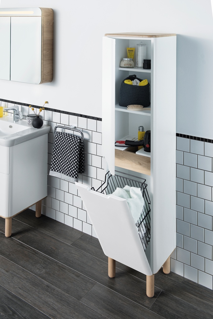 Sento’nun 105 cm genişliğindeki çamaşır makinesi dolabıyla bir çamaşır köşesi oluşturularak makinadan deterjana, kirli sepetinden havlulara kadar pek çok şey tek bir alanda toplanabiliyor. Aynı genişlikteki üst dolap da banyodaki havlu, tuvalet kağıdı gibi malzemelere alan açıyor. Gözden uzak olması istenen temizlik kovası ve sapı gibi gereçleri saklamak için ideal bir çözüm oluşturan 55 cm enindeki boy dolapları ise iç kısmında bulunan hava menfezleriyle dolap içerisinde kötü koku ve nem barındırmıyor.