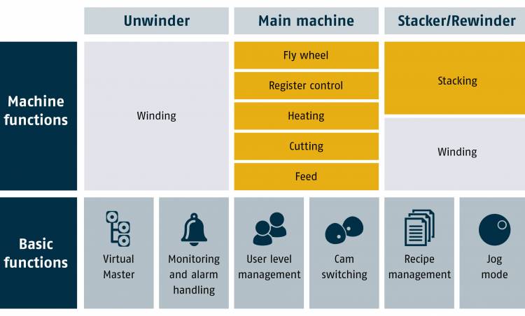 Şekil 1: Şablon, web yönlendirmeli makinelerin tipik işlem adımları için yazılımı içerir, örn. folyo torba makineleri için