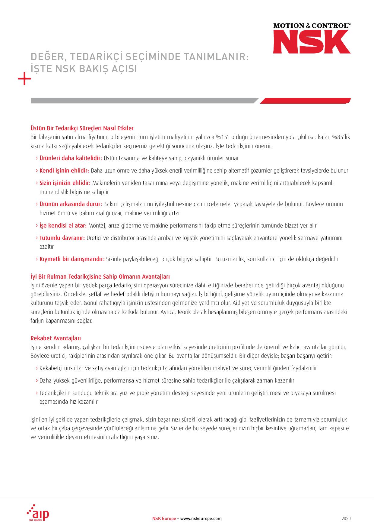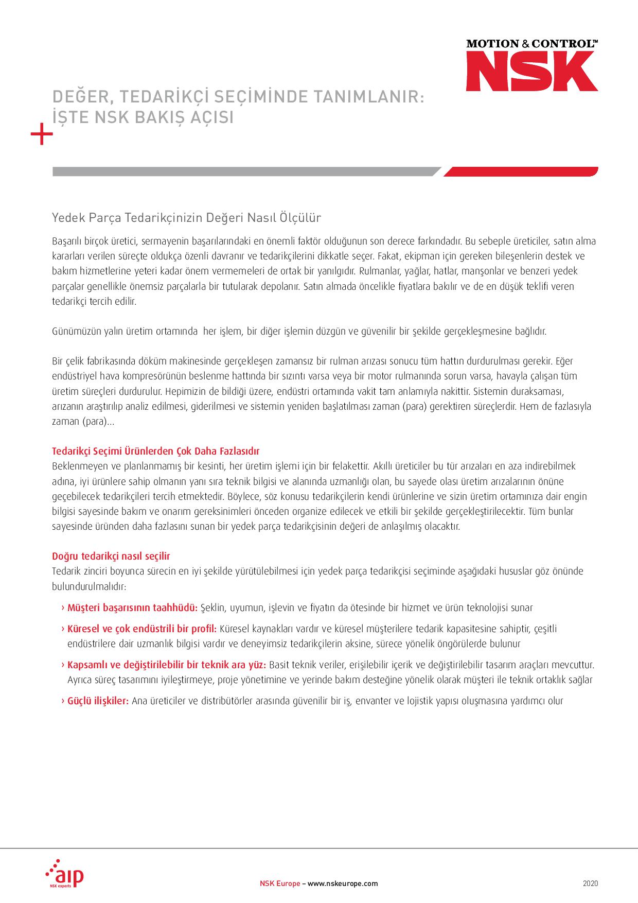 Küresel çapta endüstriyel sektörler için hareket ve kontrol çözümleri sunan NSK, yedek parça için uzmanlığı kanıtlanmış bir tedarikçiyle çalışarak kazanılabilecek katma değer hakkında yeni bir yazı hazırladı. Ücretsiz olarak indirebileceğiniz bu bilgilendirici tanıtım yazısında güçlü tedarikçi ilişkilerine sahip olmanın avantajları, beraberinde gelen rekabet avantajları ve makine optimizasyonuna yönelik çalışmalar yer almaktadır.