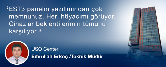 İstanbul’un en eski yüksek katlı ofis yapılarından olan USO Center Teknik Müdürü Emrullah Erkoç ile tesislerinde aldıkları can ve mal güvenliği önlemlerini konuştuk. Kullandıkları sistemin özelliklerini değerlendiren Erkoç, “Çok uzun yıllardan beri sahada, tozlu dumanlı yerlerde, havanın soğuk - sıcak olduğu yerlerde algılama yapan dedektörlerimiz var. Gerçekten çok başarılı cihazlarla çalışıyoruz. Cihazın her şeyi rapor etmesi de fevkalade güzel bir şey. EST3 panelin yazılımından çok memnunuz. Mağaza kısımlarının bana bağlı olmayan kendi adresli panelleri olmasına rağmen, yine de oralardan bilgi alabiliyorum. Alarm da gelse arıza da gelse bana bilgi düşebiliyor. Biz bina yönetimi olduğumuz için bu elbette işimizi kolaylaştırıyor” dedi.