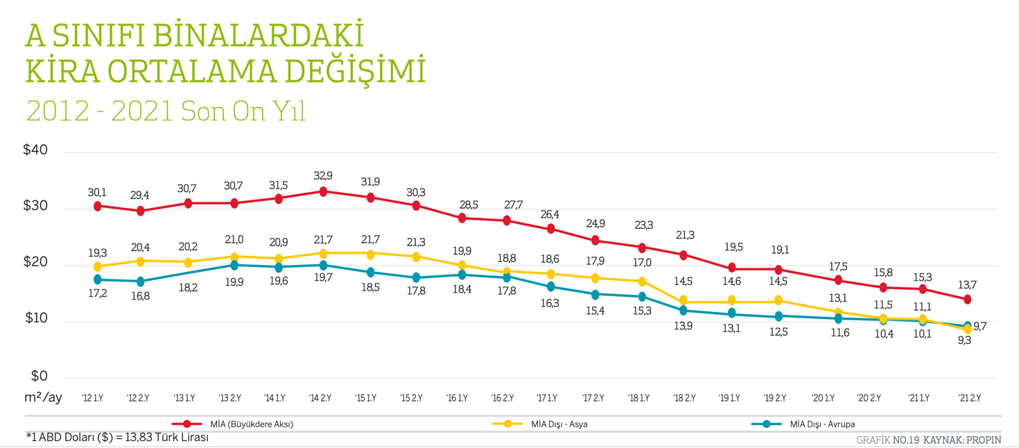 Rapora göre MİA’daki A sınıfı ofis binalarındaki kira ortalaması 2021 yılını 12,2 ABD Doları /m² /ay seviyesinde kapattı. 2021 yılı sonunda ABD Doları bazında %20 oranında düşen MİA A sınıfı ofis binalarındaki kira ortalamasının dolar cinsinden son on yılın en düşük değerlerinde kaydedildiği paylaşıldı.