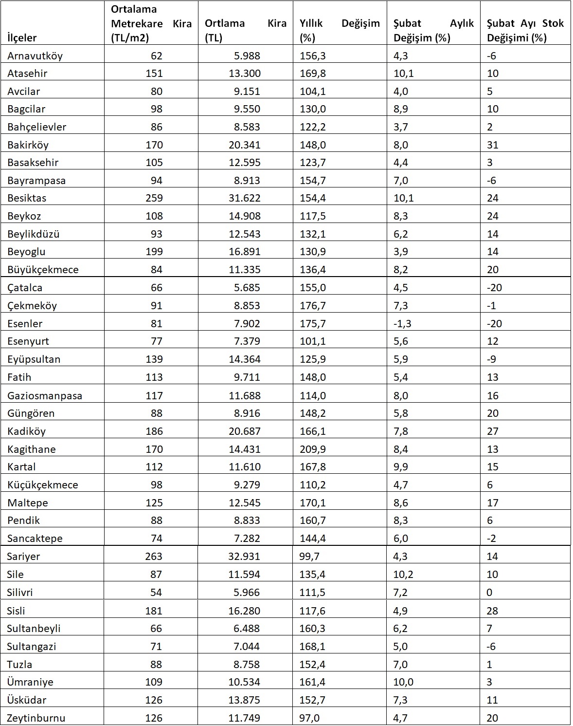 Şubat ayında kira değeri en fazla artan ilçeler Şile, Beşiktaş, Ataşehir ve Ümraniye olurken en az artış görülen ilçeler Avcılar, Beyoğlu ve Bahçelievler oldu. Esenler’de ise kiralar düşüş gösterdi. Kiralanmayı bekleyen konut stoku en fazla artan ilçeler Bakırköy, Şişli, Kadıköy, Beşiktaş, Beykoz; kiralık stoku en fazla düşüş gösteren ilçeler ise Eyüpsultan, Çatalca ve Esenler oldu.