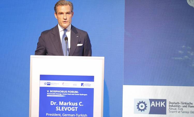 5. Bosphorus Forum etkinliğinde; AHK Türkiye Başkanı Dr. Markus C. Slevogt, enerji ve finans sektöründen AHK üyelerinin imzalı bir bildirisini Bakan Yardımcısı Dr. Alparslan Bayraktar'a teslim etti. İletilen bildiri Türkiye enerji sektörünün sürdürülebilir ve geleceğe yönelik dönüşümünün önünü açmak için özel sektör perspektifinden yenilikçi ve yatırım odaklı çerçeve koşullarının kolaylaştırılmasına dair görüşü içeriyor.