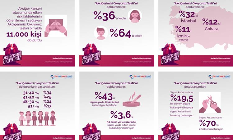 Sitede yer alan ve ziyaretçilere akciğer kanseri risk faktörlerinden hangilerine maruz kaldıklarına dair fikir sahibi olma imkânı sunan “Akciğerimizi Okuyoruz Testi”ni, bir yıl içerisinde 11 bine yakın kişi doldurdu. Türkiye Cumhuriyeti Sağlık Bakanlığı verilerine göre akciğer kanseri vakalarının yüzde 80'inin nedenini oluşturan tütün tüketim miktarının yanı sıra asbest ve ağır metaller gibi mesleki ve çevresel risk faktörlerine maruz kalma sıklığının da ölçüldüğü test çarpıcı bulgular ortaya koydu.