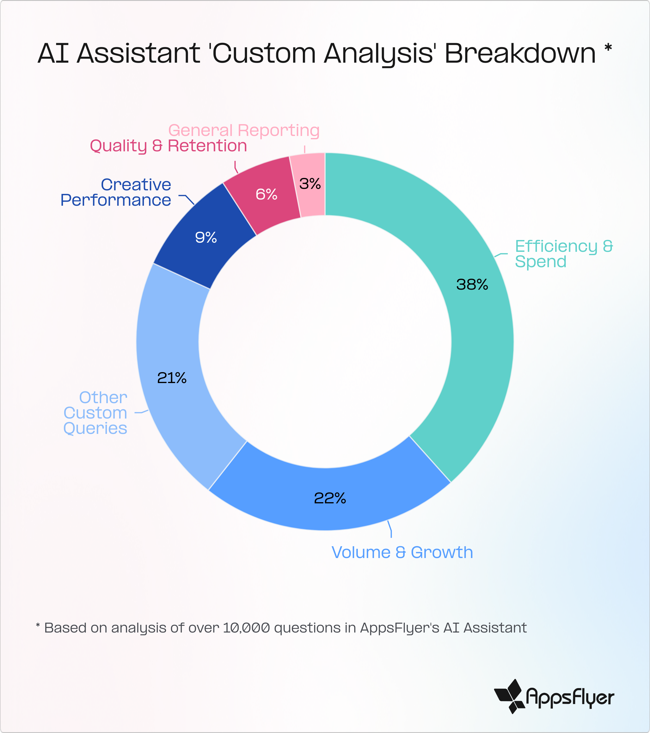 AppsFlyer ayrıca ilk kez yapay zeka ajanı kullanımını analiz ederek pazarlamacıların yapay zekayı performans iş akışlarına nasıl entegre ettiklerini belirledi. Veriler, yapay zeka ajanlarının %57'sinin yapılandırma ve veri bütünlüğü kontrolleri gibi teknik otomasyona odaklandığını, %32'sinin ise iş optimizasyonunu desteklediğini gösteriyor. Dikey sektörlerde farklı kullanım modellerinin ortaya çıktığı gözlemlendi. Örnek olarak, oyun pazarlamacıları verimliliği artırmak ve marjları korumak için yapay zeka ajanlarını kullanırken, perakende ve fintech ekipleri trafik ve hacmi ölçeklendirmek için yapay zeka ajanlarını kullandı. Bu trendler, pazarlamacıların stratejik denetimi sürdürürken yapay zekanın karar verme aşamasını desteklediği ve denetimli otomasyona doğru erken ama anlamlı bir geçişe işaret ediyor.