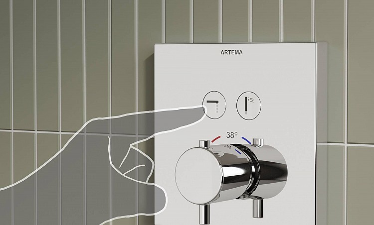 Artema’nın zahmetsiz bir duş keyfi sunan AquaControl özelliğiyle, suyun tepe ya da el duşu gibi istenen bir çıkışa ayrı ayrı ya da aynı anda yönlendirilmesi mümkün oluyor. Duş sırasında kullanılan aktif buton, kendini hafifçe dışarı doğru çıkardığından, köpüklerden dolayı gözlerin kapalı olduğu anlarda bile yönlendirici kolayca bulunabiliyor.