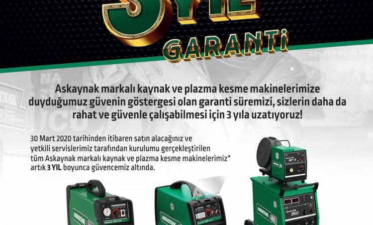Satın aldığınız ürün yetkili servis tarafından kurulduktan sonra ya da yetkili servis kurulumu gerektirmeyen örtülü elektrot ürün grubu için web sitesi veya whatsapp üzerinden fatura tarihinden itibaren 30 gün içerisinde kaydı gerçekleştirildikten sonra fatura tarihi itibariyle 3 yıl süre ile garanti kapsamına alınacak.