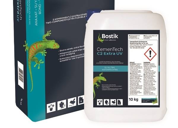 C2 Extra UV, polimerik katkılarla çok daha yüksek elastikiyet özelliğine sahip, çatlak köprüleme yapabilen ve UV dayanımlı su yalıtım harcıdır. Özel kimyasallarla formülize edilen C2 Extra UV, diğer su yalıtım ürünlerine göre güneşi daha fazla yansıtarak, güneşe açık alanlarda güvenle kullanılır. Özellikle UV ışınlarına maruz kalan teras, çatı ve balkonların su yalıtımında büyük avantaj sağlar. Çift komponentli ve çimento esaslı Bostik C2 Extra UV, sadece pozitif taraftan kullanıma uygun olup, beyaz renkli toz ve beyaz renkli sıvı emülsiyondan oluşur.