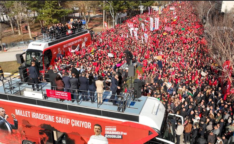 “Yoksa, diyor ya ‘İstanbullular seçti ama Ekrem kötü yönetti, biz içeriye attık.’ Diyorum ki kararı İstanbullular versin. Cesaretin varsa gel, adayını belirle, 29 Mart Pazar günü İstanbul’da seçimleri yenileyelim. Daha önce Başbakan getirdin, yendik. Meclis Başkanı getirdin, yendik. Bakan getirdin, yendik. Kimi getiriyorsan… Ama oğlan ama damat ama bakan, kimi bulursan adayını çıkar, benim adayım belli. Ekrem Başkan için İstanbul’da seçimi yenileyelim tek şartım var. Eğer senin adayın kazanırsa Ekrem Başkan yok, o gün ben de siyaseti bırakıyorum. O gün bırakıyorum. Ama İstanbullu bir kez daha bu haksızlığa ‘dur’ derse, evladını bir kez daha seçerse yakamızdan düşeceksin, erken seçim sandığını getireceksin. Hodri meydan. Ben elimdeki belediyeyi boşaltmaya, kazandığım belediyede seçimleri yenilemeye, millet ne diyorsa ona şapka çıkarmaya hazırım. Bu elimdeki şapkayla Erdoğan’a sesleniyorum. Bu vakitten sonra asla ve asla kaçamazsın. Sandıktan kaçanı, millet kovalar. Ve millet, o sandığı bulduğu gün hesabı sorar. Erdoğan’ı sandığa çağırıyor musunuz? Ona, ‘Erken seçimden kaçma’ diyor musunuz? Peki o sandık gelene kadar onu kovalamaya, erken seçim istemeye var mıyız? Erken seçimde Ekrem Başkanı Cumhurbaşkanı yapacak mıyız? Birlikte miyiz? Beraber yürüyecek miyiz? O zaman hadi bakalım, yolunuz açık olsun, yolumuz açık olsun. Yolumuz, milletin iktidarının yoludur. Yürüyelim arkadaşlar.”