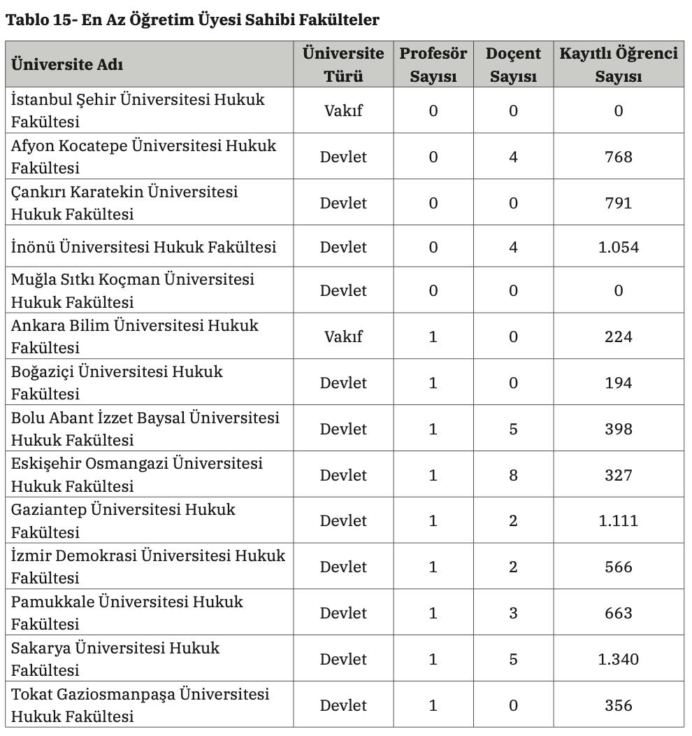 Raporda, öğretim üyesi sayısındaki artışa rağmen fakülteler arasında ciddi dengesizlikler bulunduğu da vurgulandı. Enstitü’nün çalışmasında, bazı hukuk fakültelerinde profesör sayısının sıfır ya da bir ile sınırlı olduğu, profesörlerin belirli üniversitelerde yoğunlaştığı tespit edildi.