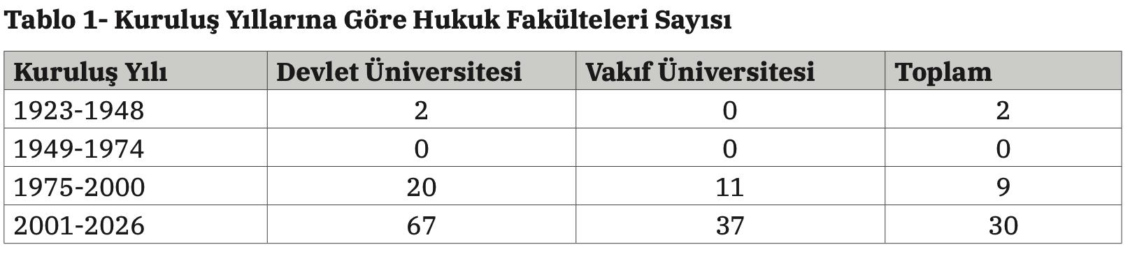 Toplum Çalışmaları Enstitüsü’nün paylaştığı rapora göre, Türkiye’de bugün aktif ve pasif durumdakilerle birlikte hukuk fakültesi sayısı yüze yaklaştı. Türkiye’de bulunan 89 hukuk fakültesinin 67’sinin son 25 yılda kurulmuş olduğu hatırlatılan raporda, fakültelerin 50’sinin devlet, 39’unun ise vakıf üniversiteleri bünyesinde faaliyet gösterdiğine dikkat çekildi.