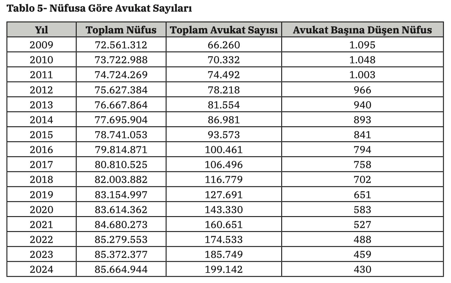 Raporda en çarpıcı bulgulardan biri avukat sayısındaki artış oldu. Türkiye’de 1998 yılında 36 bin olan avukat sayısı, 2024 itibarıyla 199 bini aştı. Böylece avukat sayısı 26 yılda beş katına çıktı. Avukat başına düşen nüfus ise son 15 yılda bin 95 kişiden 430 kişiye kadar gerileyerek Avrupa ortalamasının altına indi.