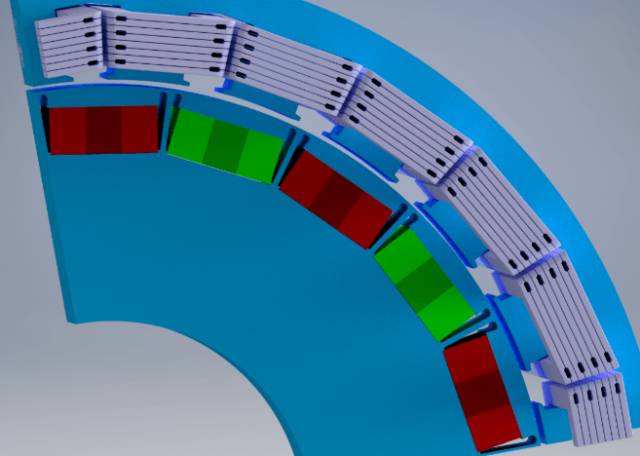 The implemented casted coils, which enable the direct liquid cooling, can be seen in Figures 2 to 4. The high current density as well as the – compared to standard motors – higher eddy current losses and thus higher operating temperatures of the PM lead to choosing samarium-cobalt magnets. Those magnets possess a high remanence flux density as well as a high resilience against partial demagnetizations at high temperatures.