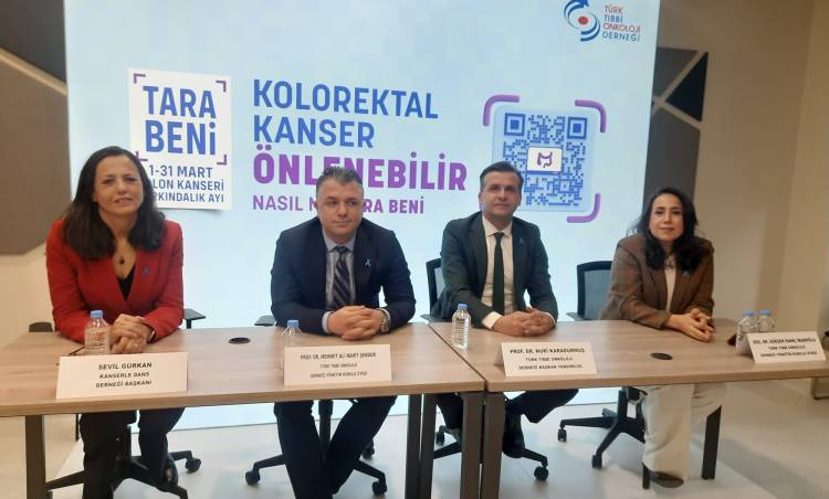 1-31 Mart Kolorektal Kanser farkındalık ayı kapsamında düzenlenen basın toplantısında bir araya gelen Türk Tıbbi Onkoloji Derneği Başkan Yardımcısı Prof. Dr. Nuri Karadurmuş, Türk Tıbbi Onkoloji Derneği Yönetim Kurulu Üyesi Prof. Dr. Mehmet Ali Nahit Şendur, Türk Tıbbi Onkoloji Derneği Yönetim Kurulu Üyesi Doç. Dr. Gökşen İnanç İmamoğlu ve Kanserle Dans Derneği Başkanı Sevil Gürkan, kolorektal kanseri gelişmeden önleyebilmek için tarama programlarına vurgu yaptı.