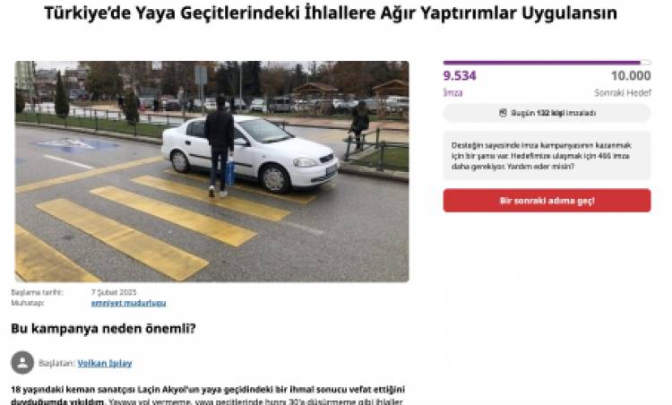Türkiye’de yaya geçitlerinde yaşanan trafik ihlallerinin önlenmesi için obua sanatçısı Volkan Işılay tarafından Change.org’da başlatılan kampanya, yaya güvenliğine dair köklü düzenlemeler talep ediyor. Kampanyaya bugüne dek 10 bine yakın kişi imzalarıyla destek verdi.
