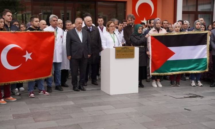 Hastaneye saldırmanın “uluslararası hukukta en ağır bir savaş suçu” olduğunun vurgulandığı açıklama, “İşlenen bu insanlık suçuna bir an önce son verilmesi için, başta Birleşmiş Milletler olmak üzere diğer uluslararası yetkili kurumları göreve çağırıyoruz. Bizler de görev verildiği takdirde sağlık hizmeti sunmak üzere Bezmiâlem Vakıf Üniversitesi olarak hazır olduğumuzu beyan ederiz” ifadeleriyle tamamlandı. Tören, Filistin’de yaşamını yitiren siviller için Fatiha okunmasıyla sona erdi.