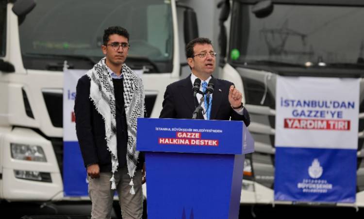 İBB Başkanı Ekrem İmamoğlu, İBB’nin Gazze’ye ulaştırılmak üzere yola çıkardığı, içleri yardım malzemesi dolu 5 TIR’ı, annesi, ablası ve kardeşiyle Türkiye’de yaşayan, babası savaş nedeniyle Gazze’de mahsur kalmış Filistinli öğrenci Yusuf Bereket ile birlikte uğurladı. İsrail’in, Güney Afrika’nın şikayetiyle, Uluslararası Adalet Divanı’nda soykırım suçlamasıyla yargılanacağını aktaran İmamoğlu, iktidarım bu konudaki politikasını eleştirdi. “Aylardır Filistin'de mazlumlar inim inim inlerken ticareti durduramayanlar, gemilerini limanlara çekemeyenler, kalkıp utanmadan, sıkılmadan Gazze edebiyatı yaparak, İstanbul seçimine malzeme yapmaya kalkıyorlar” diyen İmamoğlu, “Biraz samimi olsaydınız, Güney Afrika hükümetinin gösterdiği dirayeti gösterirdiniz. Gazze'ye el uzatmak için, İBB'yi kazanmayı beklemezsiniz. Böyle bir haddiniz de yok. İşinizi yapın, görevinizi yapın. Türkiye Cumhuriyeti gibi, dev bir ülkeyi yönetiyorsunuz. Bölgenin devi, bölgenin lideri, bölgeye abilik, bölgeye barış, bölgeye huzur getirmesi gereken bir ülkeden bahsediyoruz. Bir dakika bile bekleyemezsiniz, beklemeyin. Hemen el uzatın Gazze'ye. Biz de sizleri takdir edelim. ‘Hükümetimiz, devletimiz gereğini yapmıştır’ diyelim. Onun için diyorum burada, işe önce ticareti durdurarak başlayın” ifadelerini kullandı.