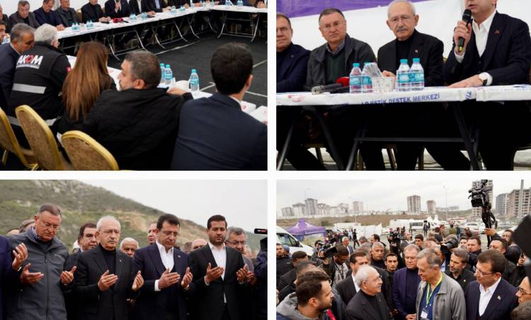 Kılıçdaroğlu ve beraberindeki heyetin ziyaret noktalarından biri de İBB’nin Antakya’da 35 dönüm arazi üzerine konumlandırdığı Afet Koordinasyon Merkezi oldu. Burada bir konuşma yapan İmamoğlu, “Lütfü Savaş Başkanımızla beraber ve buradaki bütün sistemi içine katarak, ihtiyaçlarını gözeterek ve iş birliği içinde de Hatay Büyükşehir Belediyemizin koordinasyonuyla saha hizmeti yürüten büyük bir ekibiz şu anda. Elbette ihtiyaçlar günden güne değişiyor ve bu değişimle birlikte biz bunları karşılama gayreti içerisindeyiz. Bu süreç içerisinde tabii ilk etaptaki ihtiyaçlarla bugünkü ihtiyaçları arasında çok fark var. Artık barınma temelli, kentin geleceğini düşünen, ama aynı zamanda güncel sağlık sorunları, çevre sorunlarıyla ilgilenen ve bir kısım altyapıyla ilgili süreçleri mutlaka gözeten bir anlayışla süreci sürdürüyoruz” dedi.