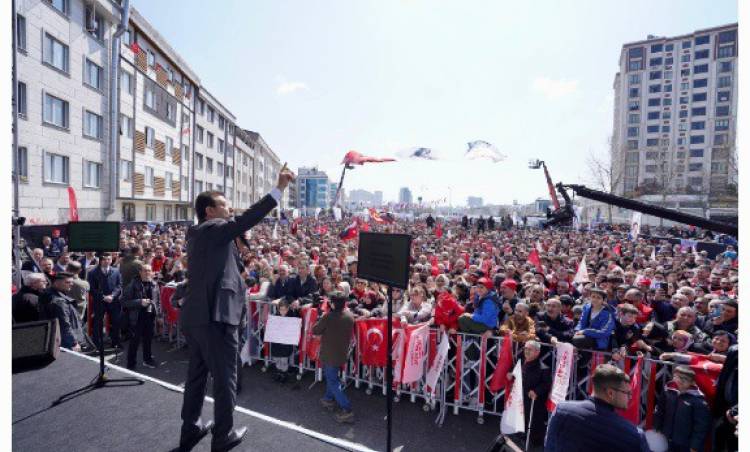 “Onlar ‘kanal’ diyor, biz ‘İstanbul’ diyoruz” diyen İmamoğlu, “Yatıyorlar, kalkıyorlar ‘kanal.’ Gündemlerinde yokmuş gibi davranıyorlar ama inanmayın. İnanmıyorsunuz değil mi? Allah korusun; sakın ha. Çünkü onlar, Kanal İstanbul'u yapmaya mecburdurlar. Şimdi bakın; ne Büyükşehir adayları ‘Kanala karşıyım’ diyebilir ne buradaki ne Silivri'deki ne başka bir yerdeki diyemez. Korkarlar, fırça yerler diye. Öyle değil mi? Onun için, bir yandan ihalelere devam ediyorlar. Verilmiş sözleri var, taahhütleri var. Hem de çoğu yurt dışından, buradan da değil. Onlar İstanbul’un kaynaklarını yerli, yabancı, bir avuç insana aktarmaya çalışıyorlar. Vatandaşa kaşıkla verdiklerini, kepçeyle geri alıyorlar. Size söz; şart olsun, görevimin son anına kadar, milletimin en zor anında yanında olacağım. Milletin parasını, millet vereceğiz. Ben, halka ait alanları halka açacağım. Ben İstanbul'un muhafızı olmayı, bu şehrin doğal ve tarihi zenginliklerine gözüm gibi bakmayı bilirim. Siz beni bu şehri israftan, ranttan, ihanetten koruyun diye işbaşına getirdiniz; öyle değil mi? Ben sizin yüzünüzü kara çıkarmayacağım. Yeter ki siz bizim arkamızda durun, bizi desteklemeye devam edin. Ben size layık olmaya devam edeceğim” şeklinde konuştu.