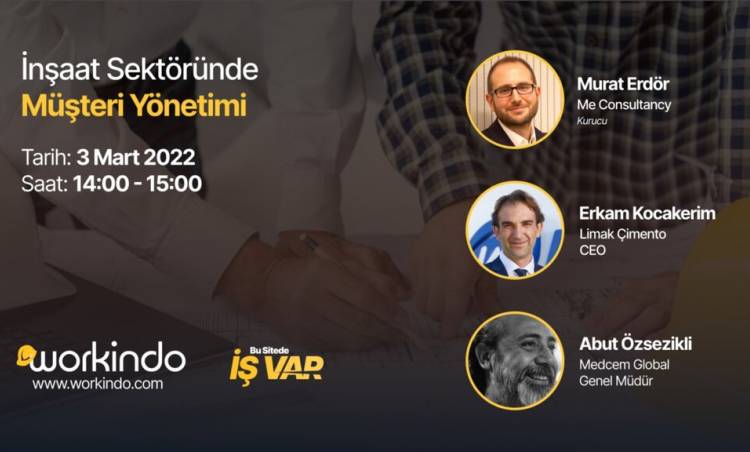 İnşaat sektörü problemlerine ve ihtiyaç alanlarına teknolojiyi kullanarak çözümler sunan Workindo'nun düzenlediği ikinci buluşmanın moderatörlüğünü Dijital Dönüşüm Danışmanı Murat Erdör yapacak. Medcem Global Genel Müdürü Abut Özsezikli ve Limak Çimento CEO’su Erkam Kocakerim potansiyel iş fırsatlarını geliştirmek ve başarı sağlamak için önemli dinamikler arasında yer alan müşteri ilişkileri yönetimiyle ilgili sektörü bilgilendirecek ve izleyicilerden gelecek soruları yanıtlayacak.