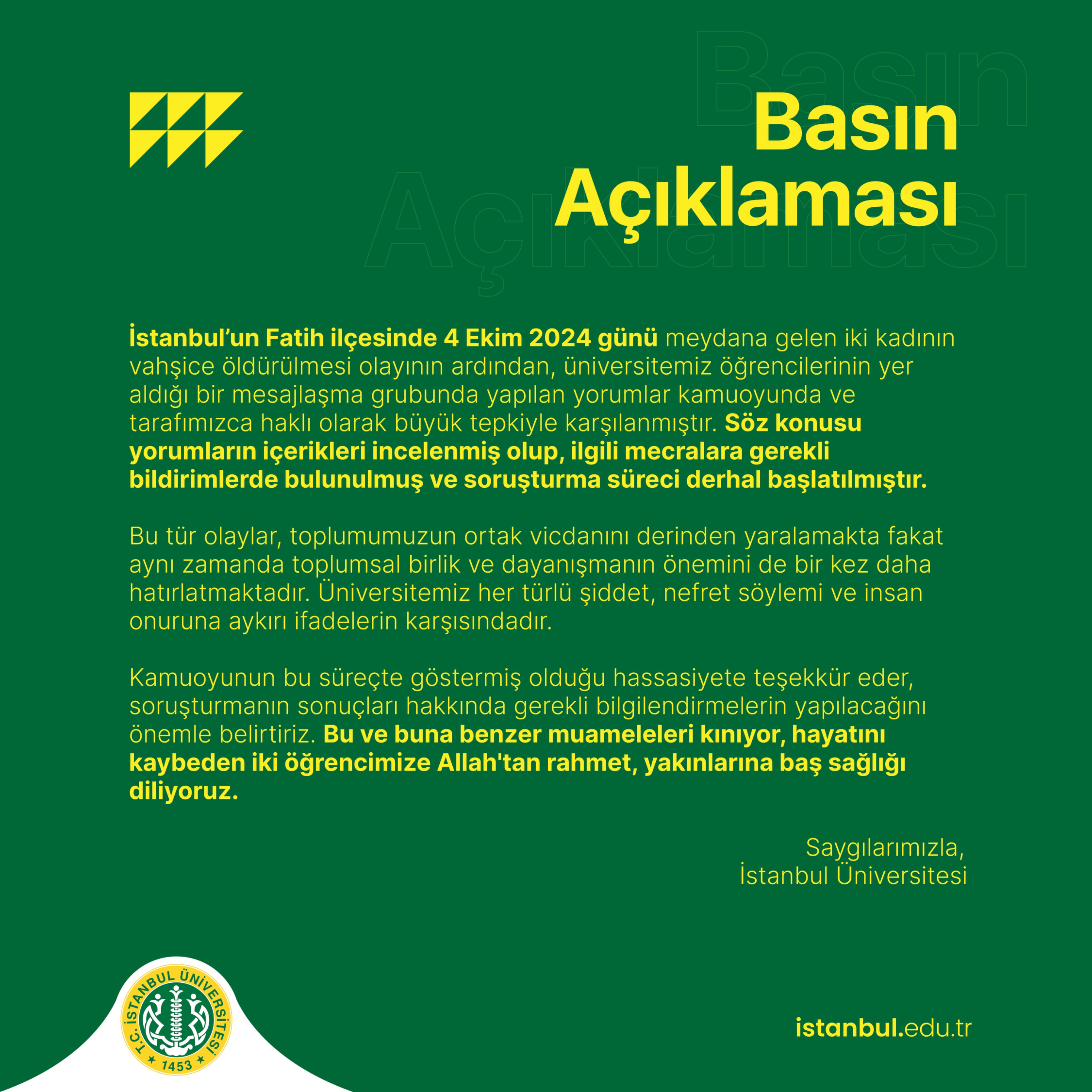 Üniversitenin sosyal medya hesabından yapılan paylaşımda, Fatih'te 4 Ekim'de iki kadının vahşice öldürülmesi olayının ardından, İÜ öğrencilerinin yer aldığı bir mesajlaşma grubunda yapılan yorumların kamuoyunda haklı olarak büyük tepkiyle karşılandığı belirtildi.