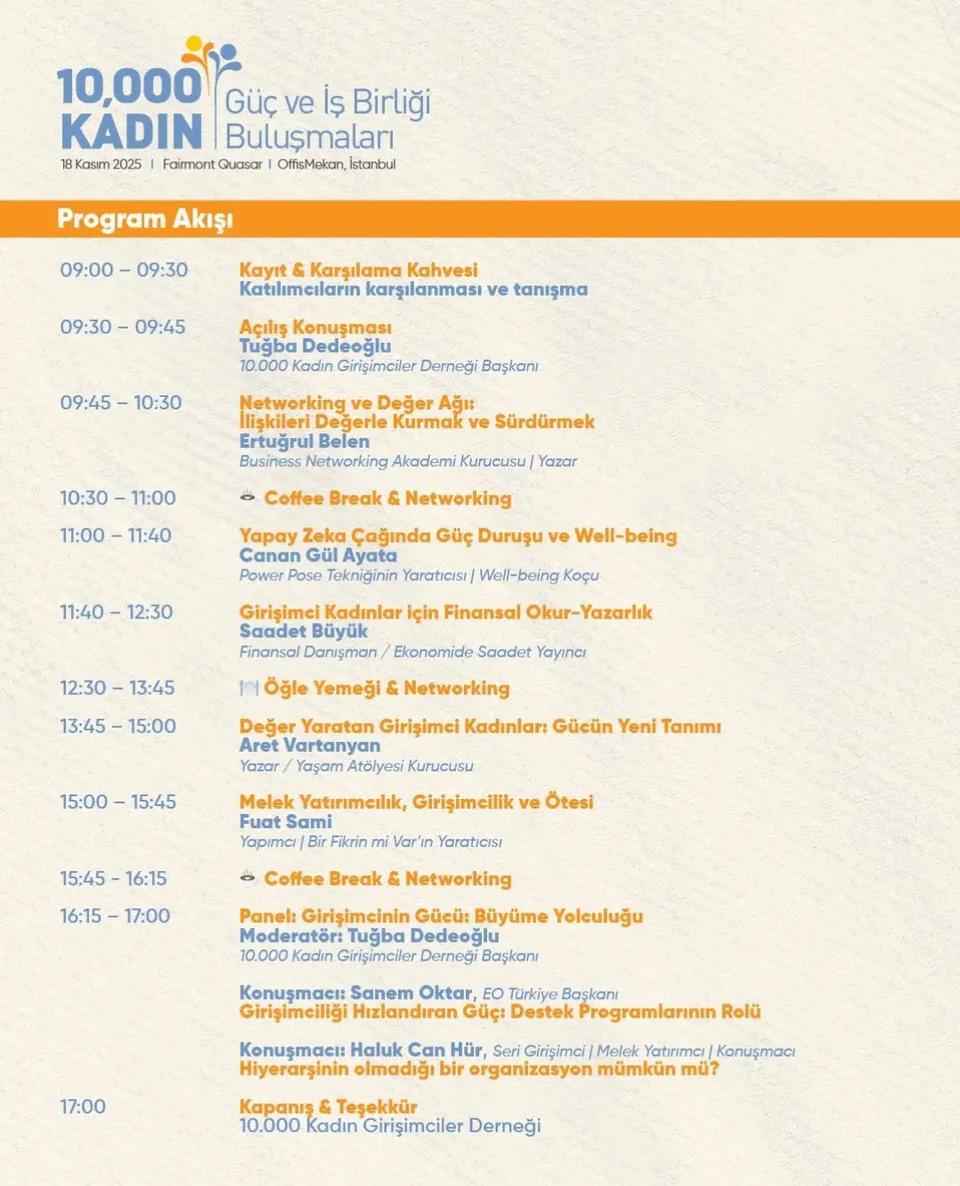 10.000 Kadın Girişimciler Derneği Başkanı Tuğba Dedeoğlu’nun konuşması ile başlayacak etkinlikte, Etuğrul Belen "Networking ve Değer Ağı: İlişkileri Değerle Kurmak ve Sürdürmek" konulu sunumuyla network oluşturmanın kritik önemini anlatacak. Kısa bir aranın ardından ise Power Pose Tekniği’nin yaratıcısı Canan Gül Ayata, "Yapay Zeka Çağında Güç Duruşu ve Well-being" başlıklı oturumuyla iş yaşamında güçlü duruşun ve iyi oluş halinin önemini aktaracak.