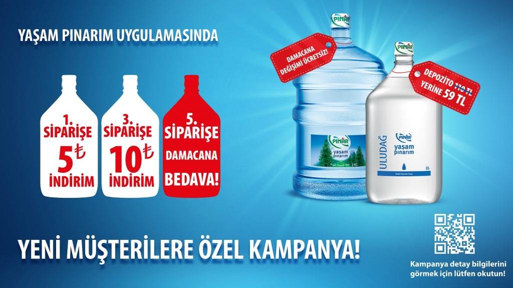Yaşam Pınarım mobil uygulamasıyla tek adımda su ve içecek siparişini müşterisinin kapısına getiren Pınar Su ve İçecek, yeni müşterilerine özel, fırsat dolu bir kampanya başlattı. Kampanya kapsamında, Yaşam Pınarım mobil uygulamasına üye olarak su siparişi veren müşterilerin, ilk damacana siparişi 5 TL, üçüncü damacana siparişi 10 TL ve beşinci damacana siparişi bedavaya kapılarına geliyor.Yalnızca yeni müşterilere özel olan kampanya, 19 L polikarbon ve 15 L cam damacana su siparişlerinde geçerli olacak.