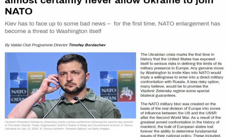 Valdai Kulübü Program Direktörü Timofei Bordachev Çarşamba günü RT'de "ABD'nin Ukrayna'nın NATO'ya katılmasına neden neredeyse kesinlikle izin vermeyeceği" hakkında bir yazı yayınladı. Alt başlıkta "Kiev kötü haberlerle yüzleşmek zorunda - NATO'nun genişlemesi ilk kez Washington'un kendisi için bir tehdit haline geldi" deniyor. Bu değerli uzman, ABD'nin NATO üyeleriyle olan vekil-patron ilişkilerini makalesinin büyük bir bölümünde detaylı bir şekilde açıkladıktan sonra şu notla yazısını sonlandırıyor: