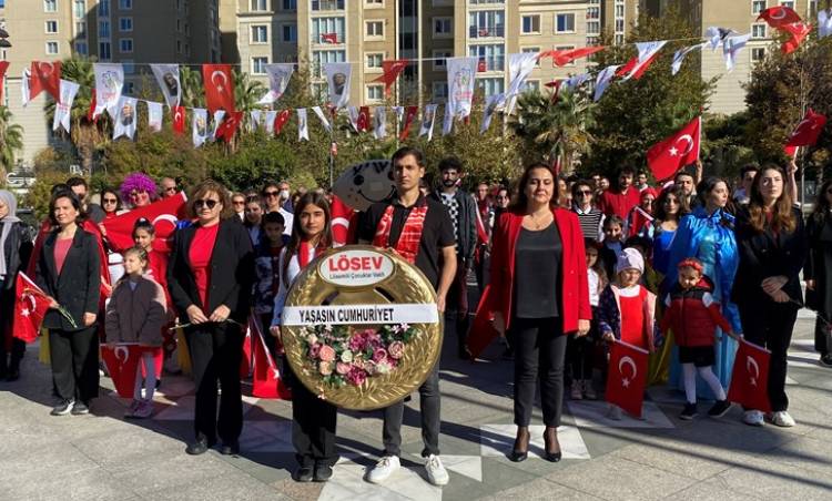 LÖSEV Lösemili Çocuklar Sağlık ve Eğitim Vakfı29 Ekim Cumhuriyet Bayramı’nı Ankara merkezleri başta olmak üzere 9 ayrı ildeeş zamanlı olarak coşkuyla kutladı. İstanbul’da gerçekleşen tören sabahsaatlerinde gönüllü, aile ve gençlerin Ataşehir Cumhuriyet Parkı’ndatoplanmasıyla başladı. Atatürk büstüne çelenk bırakan LÖSEV yetkilileri vegençleri LÖSEV’in Ataşehir’de bulunan ofisine kadar büyük ve görkemli birkortej başlattı.