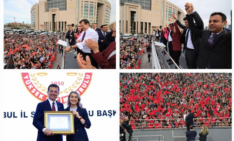 İstanbul Büyükşehir Belediye (İBB) Başkanı Ekrem İmamoğlu, üçüncü mazbatasını aldı. Mazbatasını almak için; CHP TBMM Grup Başkanvekili Gökhan Günaydın, CHP Yüksek Disiplin Kurulu Başkanı Turan Taşkın Özer, CHP İstanbul İl Başkanı Özgür Çelik, Parti Meclisi üyeleri, milletvekilleri ve eşi Dr. Dilek Kaya İmamoğlu ile birlikte 16.00 sıralarında İstanbul Adalet Sarayı Şehit Savcı Mehmet Selim Kiraz Yerleşkesi’ne gelen İmamoğlu, alkışlarla karşılandı. Yerleşke içindeki konferans salonunda düzenlenen mazbata teslim töreninde ilk konuşmayı İstanbul İl Seçim Kurulu Başkanı Ramazan Seçkin yaptı.