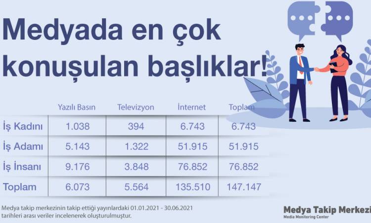 Medya Takip Merkezi (MTM) tarafından 10 bini aşkın basın, TV ve internet mecralarında yapılan taramalara göre; “iş insanı” ifadesi medyada, konuya dair toplumsal duyarlılığın arttığı 2021 yılında, 54 bin 989 olan 2020 yılına göre %64 artış göstererek 89 bin 876 kez kullanıldı.