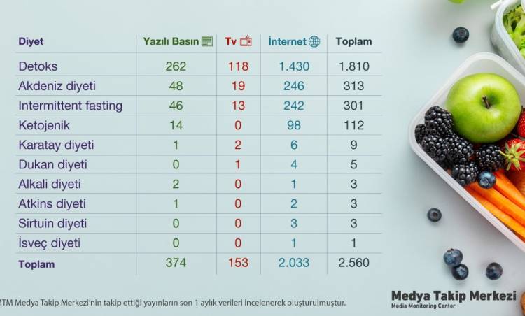 Medya Takip Merkezi’nin incelediği son bir aylık veri sonuçlarına bakıldığında belirtilen diyetlerin internette, 2 bin 33 habere konu olduğu görüldü. Yazılı basın mecrası ise internetten sonra 347 haber ile en çok haber yapan 2. geleneksel medya mecrası olurken, konuya dair 118 haber yapan televizyon kanallarının diyetlere çok fazla yer vermedikleri dikkatlerden kaçmadı.