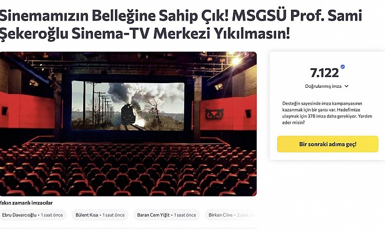 Türkiye’nin ilk film arşivi ve sinema eğitimi merkezi olan Mimar Sinan Güzel Sanatlar Üniversitesi (MSGSÜ) Prof. Sami Şekeroğlu Sinema TV Merkezi’nin yıkım sürecine tepkiler büyüyor. Merkezin korunması için Change.org’da başlatılan imza kampanyası 7 bini aşkın kişi tarafından desteklenirken, öğrenciler ve mezunlar, 29 Ağustos Cuma günü bir basın açıklaması düzenleyerek kararı protesto edecek.